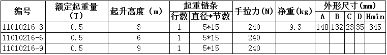 起重量0.5噸的手拉葫蘆技術(shù)參數(shù):