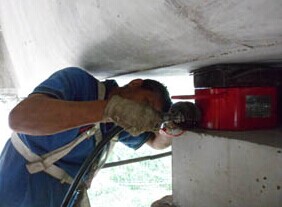 圖中的千斤頂被操作者放置在橋梁下方,進行操作,讓千斤頂頂升到一定的位置,起到支撐作用,保持橋梁的整體平衡性。